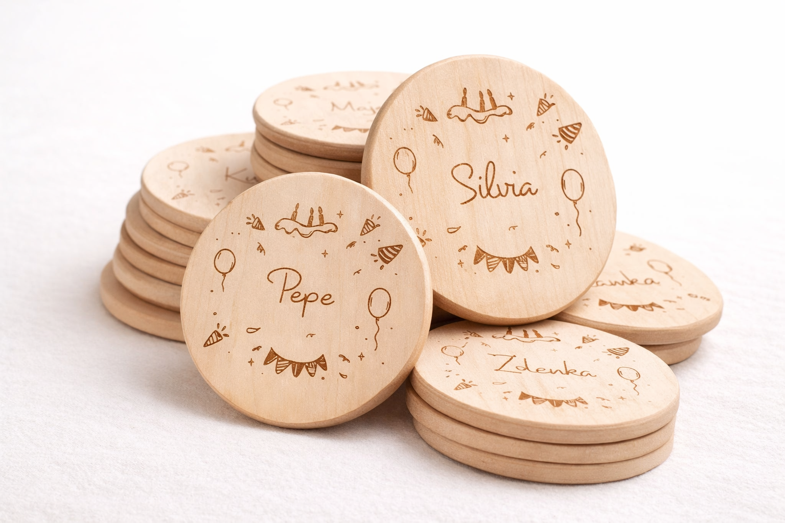Pri svadbách a oslavách pomáhame doladiť drobné prvky, ktoré spolu vytvárajú jednotný celok. Vyrábame svadobné oznámenia, menovky na stôl, čísla stolov, uvítacie tabule, toppers na torty aj darčeky pre hostí, vždy prispôsobené zvolenému štýlu, farbám a motívu.
